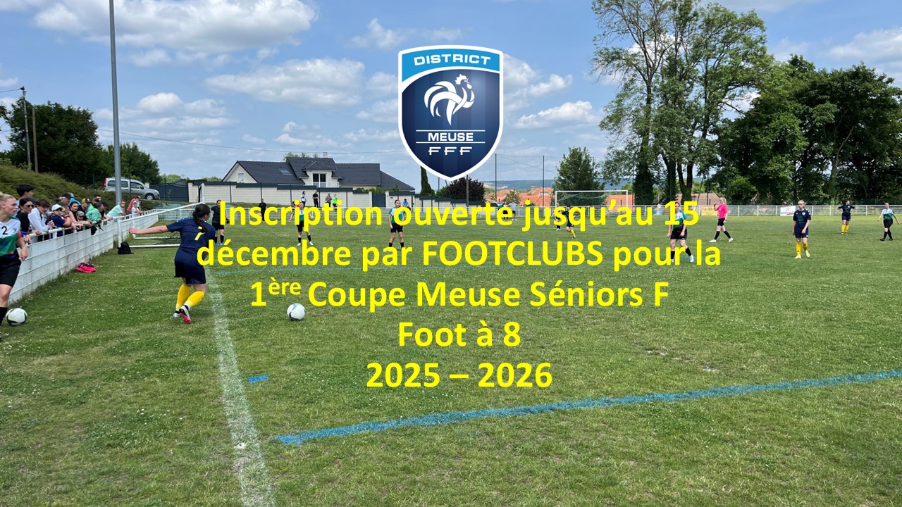 Inscription ouverte (jusqu'au 15 décembre) par FOOTCLUBS pour la 1ère coupe Meuse Séniors F en Foot à 8 qui se déroulera au printemps 2026.