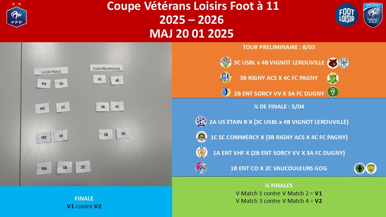 Les matchs du tour préliminaire de la 2ème phase de la coupe Meuse des Vétérans Loisirs sont en ligne. Matchs programmés le dimanche 8 mars 2026 et à jouer pour...
