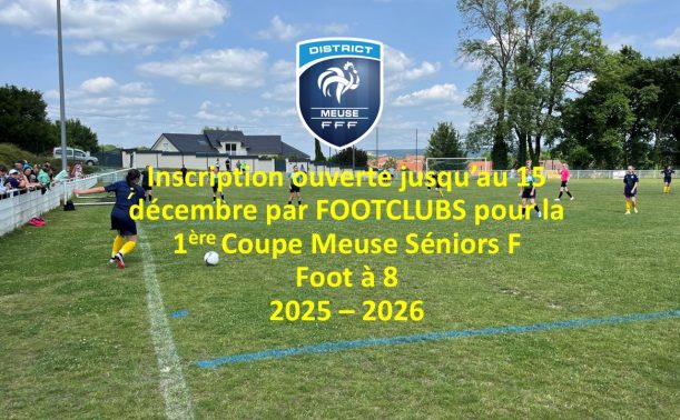 Inscription ouverte (jusqu’au 15 décembre) par FOOTCLUBS pour la 1ère coupe Meuse Séniors F en Foot à 8 qui se déroulera au printemps 2026.