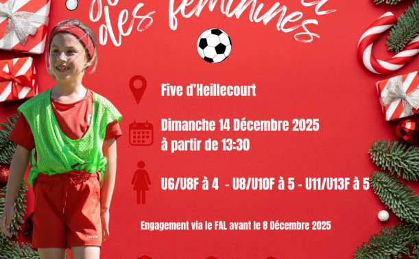 Comme les saisons précédentes, le District Meurthe et Moselle de Football invite les clubs meusiens à participer à sa traditionnelle journée de Noël des féminines le Dimanche 14 décembre 2025 à partir de 13H30 sur le complexe du Five à Heillecourt (2 allées des Tilleuls, 54180, Heillecourt)