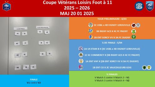 Les matchs du tour préliminaire de la 2ème phase de la coupe Meuse des Vétérans Loisirs sont en ligne.
